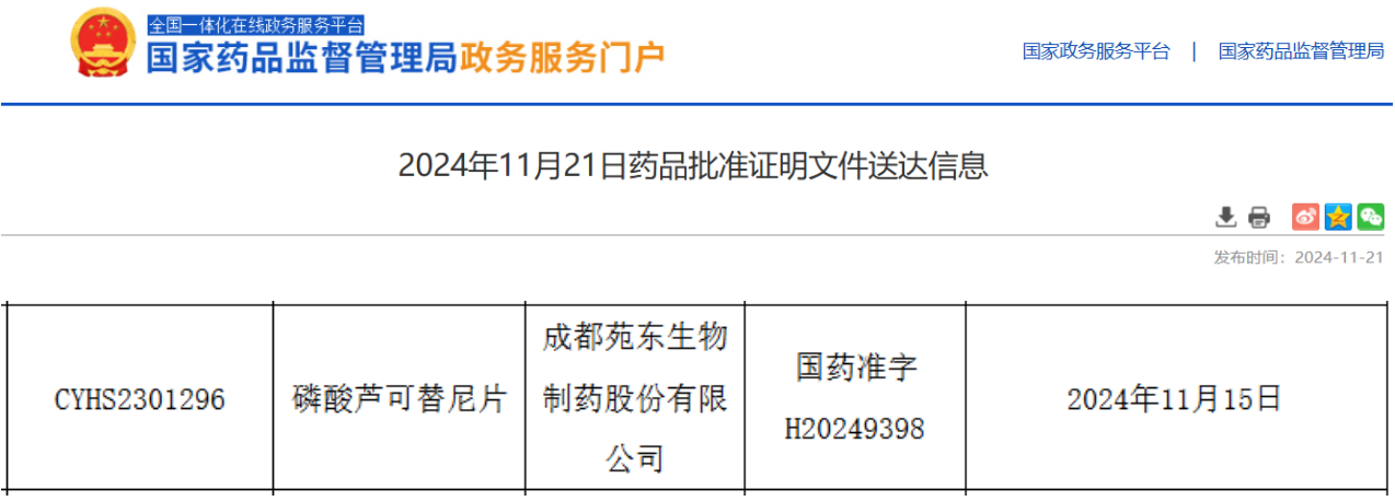 11月21日,成都苑东生物制药提交的4类仿制药磷酸芦可替尼片上市申请获批并视同过评。该产品是一款重磅JAK抑制剂,此前该品种仅有原研产品在国内销售,此次苑东生物获批,为该药物的首家仿制药企。