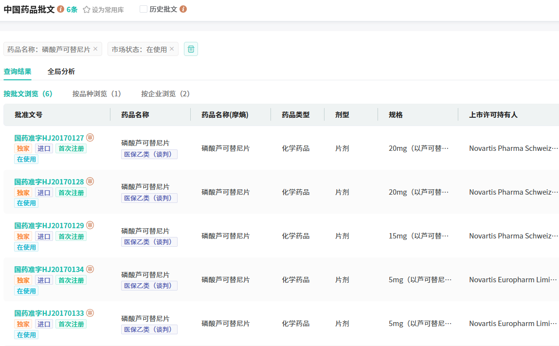 磷酸芦可替尼片原研企业为Incyte,是一款JAK1/2 抑制剂,2009年诺华与Incyte达成合作协议,获得芦可替尼美国以外市场的商业化权利。最早于2011年11月首次在美国获批上市。据统计,2023年磷酸芦可替尼片的全球销售额合计超过43亿美元。2019年,磷酸芦可替尼片通过医保谈判进入国家医保,该品种进入国家医保后销售额快速攀升,据摩熵医药数据库显示,2023年在全国院内市场的销售额超5亿元,同比增长达21.12%。