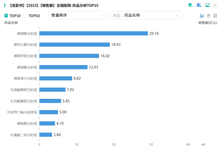 碘佛醇注射液是临床广泛应用的造影剂之一,属于非离子型、低渗、水溶性且X线不透射的造影剂,主要通过血管内给药。其作用原理在于,造影剂注入血管后,能使流经的血管区域呈现不透光性,从而在X光照射下清晰显影。该产品于1988年率先获得美国FDA批准上市,1999年成功引入中国市场,2000年被纳入国家医保乙类目录,2009年更进一步升级至医保甲类目录。据摩熵医药数据库显示,碘佛醇注射液在2023年全国院内市场的销售额超29亿元,同比增长达10.69%,同时碘佛醇注射液是2023年造影剂院内TOP1品种。