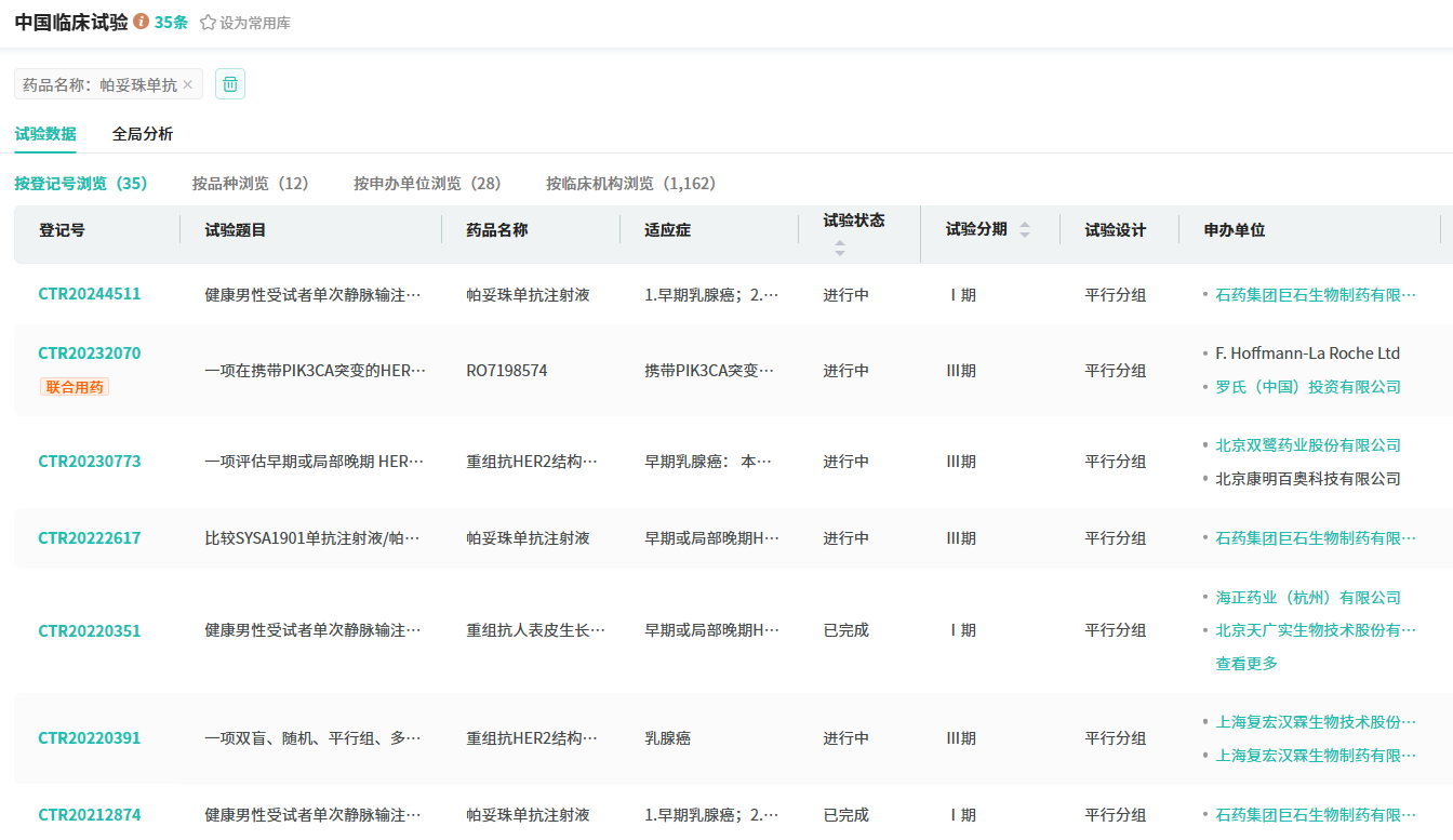 在帕妥珠单抗生物类似药的研发热潮中,国内药企如雨后春笋般层出不穷,超过20家企业正全力推进该药物的Ⅰ至Ⅲ期临床试验。帕妥珠单抗生物类似药的赛道上,已汇聚了诸如齐鲁制药、正大天晴、博锐生物等一众明星企业。这些企业不仅深耕帕妥珠单抗生物类似药市场,还积极涉足曲妥珠单抗生物类似药领域,力求实现“双剑合璧”的战略布局。