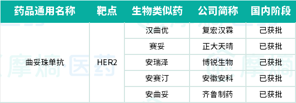 罗氏在HER2药物领域长期占据领先地位,但随着生物类似药的价格竞争和ADC产品的直接挑战,其品牌药物压力倍增。目前在国内曲妥珠单抗已有齐鲁制药、正大天晴药业、博之锐生物制药、安科生物、复宏汉霖生物制药五家企业获得上市批准,对罗氏展开攻势,意图分割原研药的市场份额。