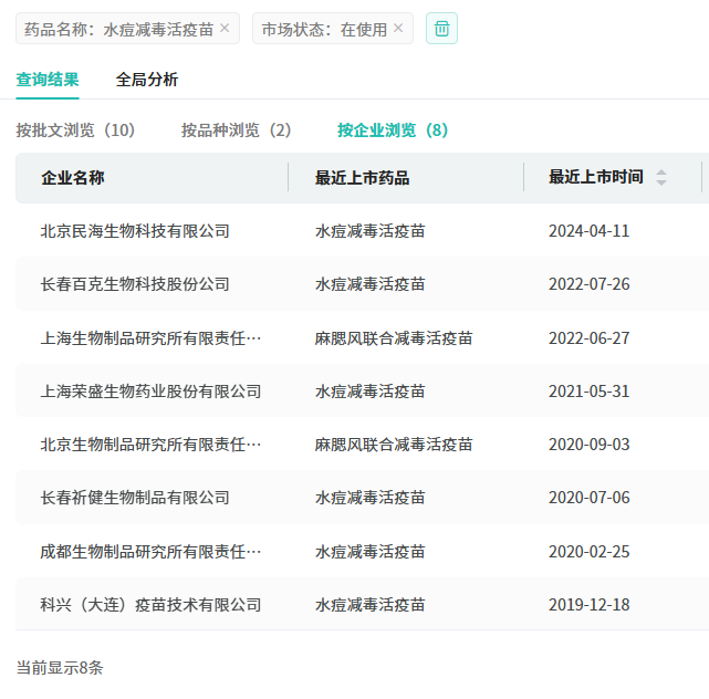 目前,国内已上市水痘减毒活疫苗的药企有8家,包括北京生物制品研究所、北京民海生物、科兴(大连)疫苗技术、上海荣盛生物药业、成都生物制品研究所、长春百克生物、上海生物制品、长春祈健生物制品药企,市场竞争异常激烈。