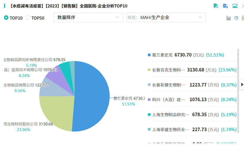 从2023年全国院内水痘减毒活疫苗销售TOP10榜单的企业竞争格局来看,葛兰素史克以高达51.51%的市场份额,强势占据院内市场领先地位;长春百克生物科技紧随其后,凭借23.96%的市场份额位列第二;而长春祈健生物制品则以9.37%的市场份额,稳固占据榜单第三名的席位。