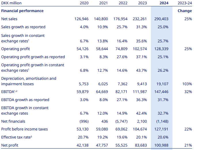 2月5日,丹麦诺和诺德公司正式公布了2024年年报。诺和诺德全年营收2904.03亿丹麦克朗(约合421.3亿美元),同比增长25%,营业利润1283.39亿丹麦克朗(约合186.2亿美元),同比增长25%,净利润1009.88亿丹麦克朗(约合146.5亿美元),同比增长21%。值得一提的是,诺和诺德的盈利水平(营业利润/销售额)高达44.19%,让美国哪些创新巨头望尘莫及。