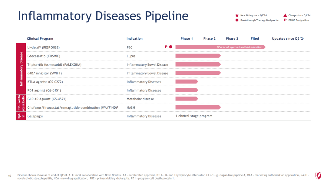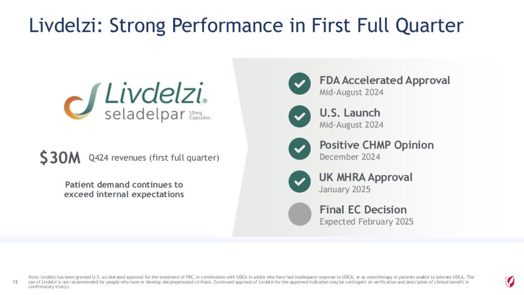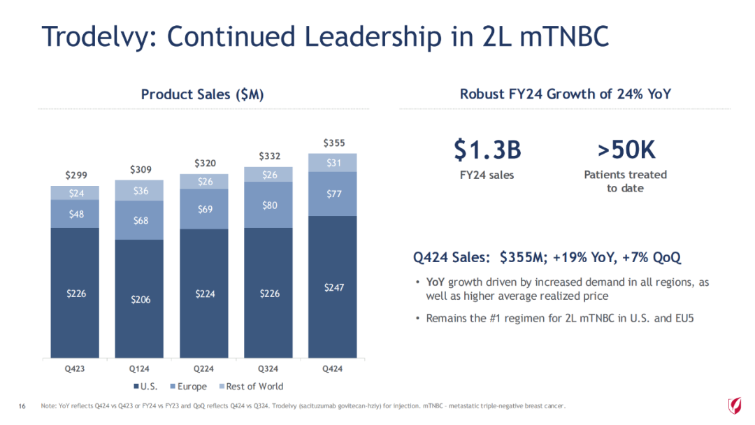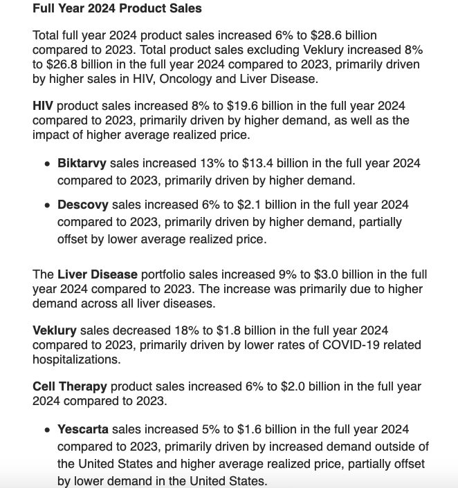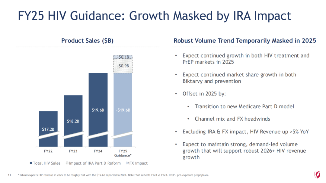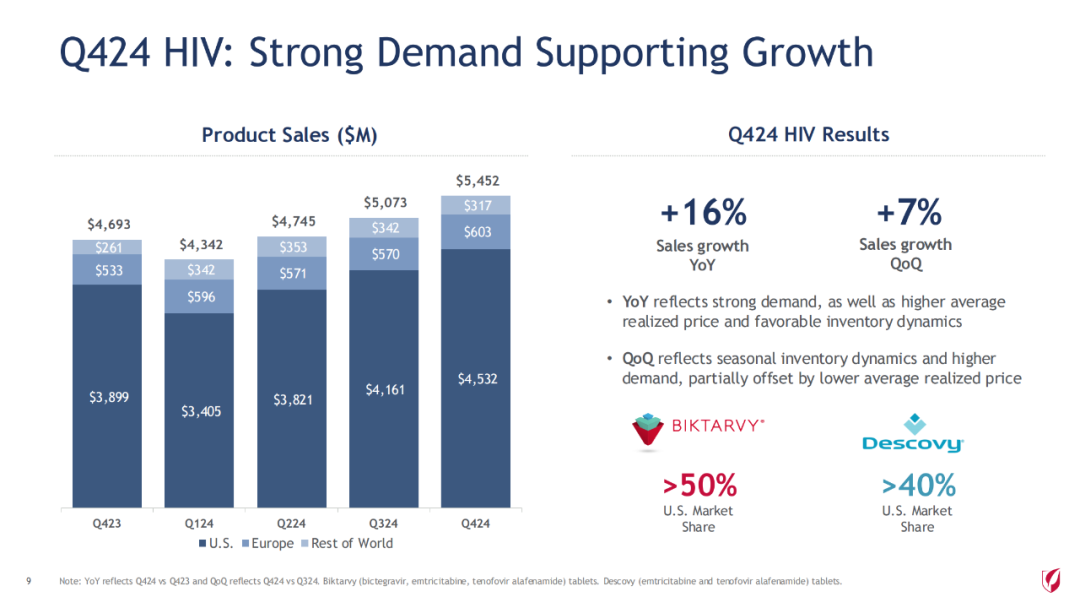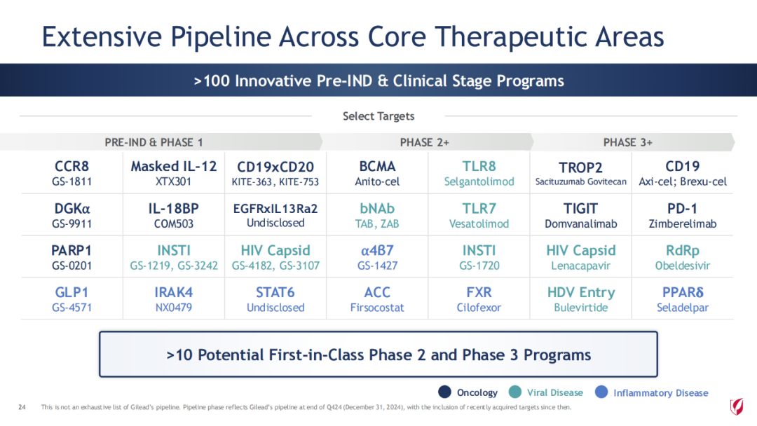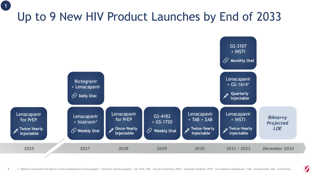 2024财年,公司旗舰药物 Biktarvy单产品(必妥维)(比克恩丙诺片,bictegravir/emtricitabine/tenofovir alafenamide)增长13%,达134亿美元,本品占据超过美国50%市场份额。本品是一款全新的无助推(unboosted)整合酶链转移抑制剂(INSTI),现有的基于整合酶链转移抑制剂的最小的三联复方单片制剂。将在2033年失去市场独占权。除了单组分的来那卡帕韦,吉利德到2033年底将推出7种新的HIV治疗方案,包括12个新分子和11个组合药物。