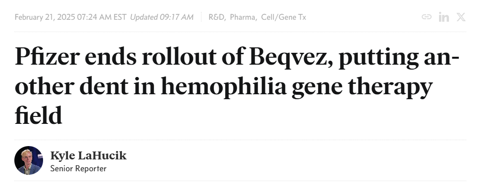 2024年12月,辉瑞终止了与 Sangamo Therapeutics 合作的血友病 A 基因疗法giroctocogene fitelparvovec(giro-vec),尽管该产品在三期临床试验中取得了积极结果,并即将提交监管申请。