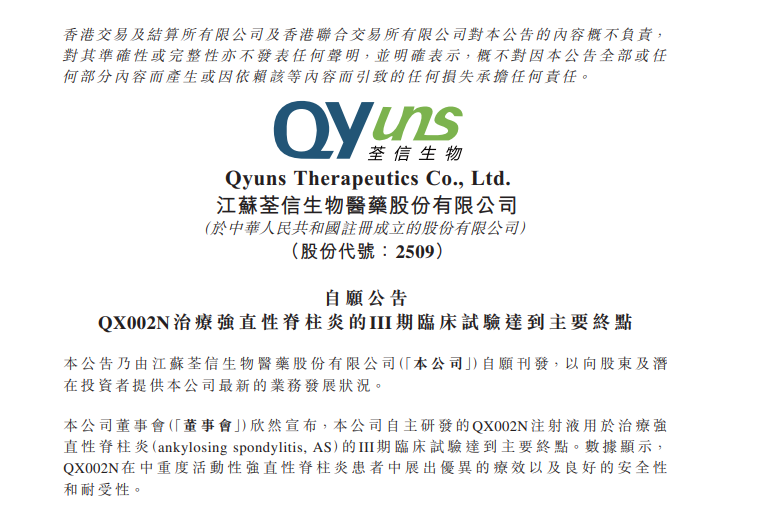 2月24日,荃信生物发布公告,公司自主研发的IL-17A单抗QX002N注射液用于治疗强直性脊柱炎的III期临床试验达到了主要终点。
