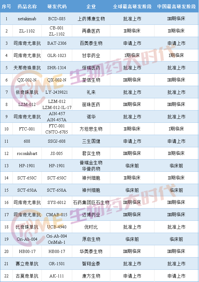目前国内约有22家企业布局IL-17A单抗,其中康方生物、三生国健的IL-17A单抗都在申请上市阶段;丽珠医药、荃信生物、君实生物等多家药企的IL-17A单抗都处于临床3期状态,竞争仍非常激烈。