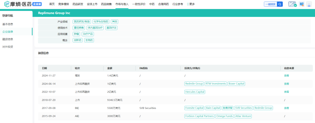 截图来源:摩熵医药数据库融资信息
