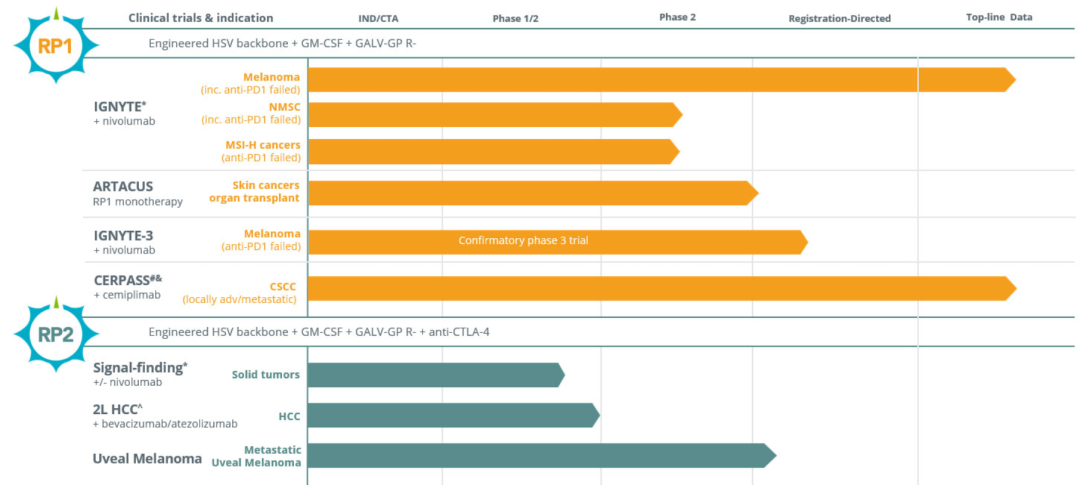 针对肝细胞癌的临床试验2期研究(RP2-003试验,根据与罗氏公司签订的合作与供应协议进行)是一项开放标签试验,主要评估RP2与阿替利珠单抗和贝伐珠单抗二线疗法对局部晚期不可切除、复发和/或转移性肝细胞癌患者的联合治疗效果。另外,RP2-001-18试验是一项临床试验1期研究,旨在研究RP2单独或与纳武利尤单抗联合用于实体瘤患者,主要研究这种疗法对患者的安全性,并评估其缩小肿瘤的能力。