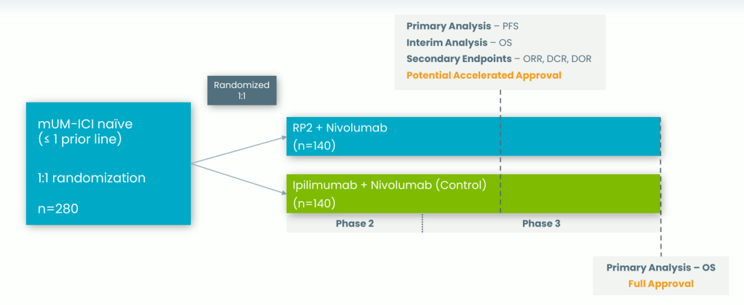RP2在RP1的基础上进一步添加了抗CTLA-4抗体,旨在治疗更多免疫沉默的肿瘤类型,这种双重免疫激活策略有望进一步增强治疗效果。2025年1月初,Replimune宣布首批患者已被纳入RP2针对检查点不成熟的转移性葡萄膜黑色素瘤和二线复发或转移性肝细胞癌(HCC)的评估研究。这项RP2-202试验是一项临床试验2/3期研究,旨在评估RP2联合纳武利尤单抗与伊匹木单抗联合纳武利尤单抗治疗未接受过免疫检查点抑制剂治疗的成年转移性葡萄膜黑色素瘤患者的疗效,研究的主要终点是总生存期和无进展生存期,次要终点是总缓解率和疾病控制率。