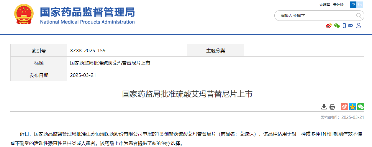 3月21日,国家药品监督管理局官网发布公告,恒瑞医药申报的1类创新药硫酸艾玛昔替尼片(商品名:艾速达)批准上市,用于治疗对一种或多种TNF抑制剂疗效不佳或不耐受的治疗疗效欠佳或不耐受的活动性强直性脊柱炎(AS)成人患者(受理号:CXHS2300071),标志着我国自免领域JAK抑制剂赛道再迎重要突破。