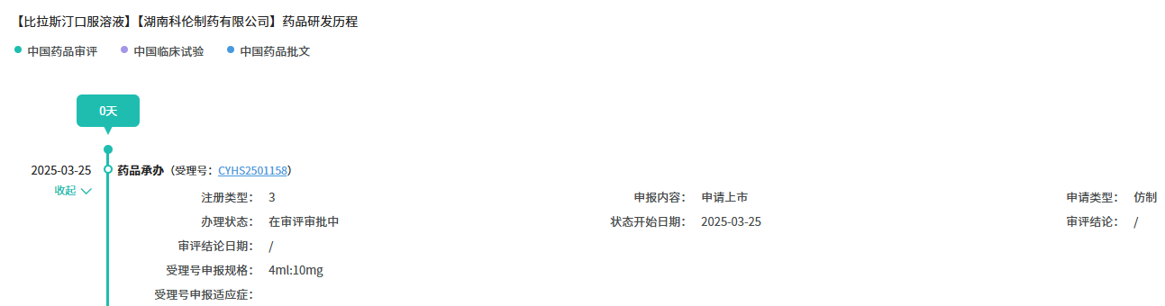 2025年3月25日,湖南科伦制药有限公司按注册分类3类申报的比拉斯汀口服溶液上市申请获受理。公开资料显示, 比拉斯汀(Bilastine)是一种非镇静型长效抗组胺药,属于第2代组胺H1-受体拮抗剂,临床上主要用于过敏性鼻炎(季节性和常年性)和荨麻疹的对症治疗。