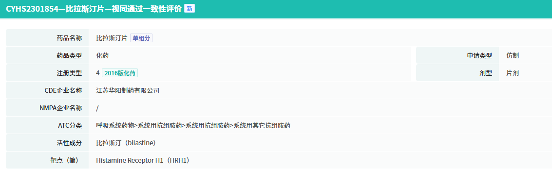 2024年11月,江苏华阳制药比拉斯汀片(商品名:新敏特®)通过4类仿制药注册类型获得NMPA批准上市,成为国内首个过评的产品。