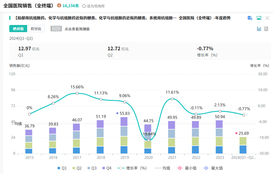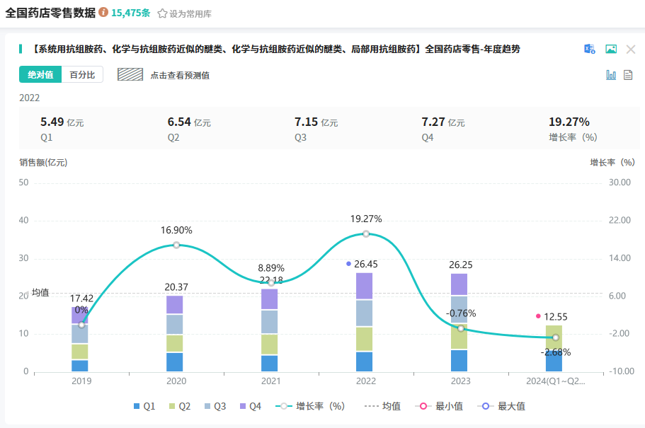 据摩熵医药销售数据库显示,2023年和2024年上半年全国医院端抗组胺药物的销售额分别为50.94亿元和25.69亿元;全国药店零售端的销售额分别为26.25亿元和12.55亿元。市场巨大。