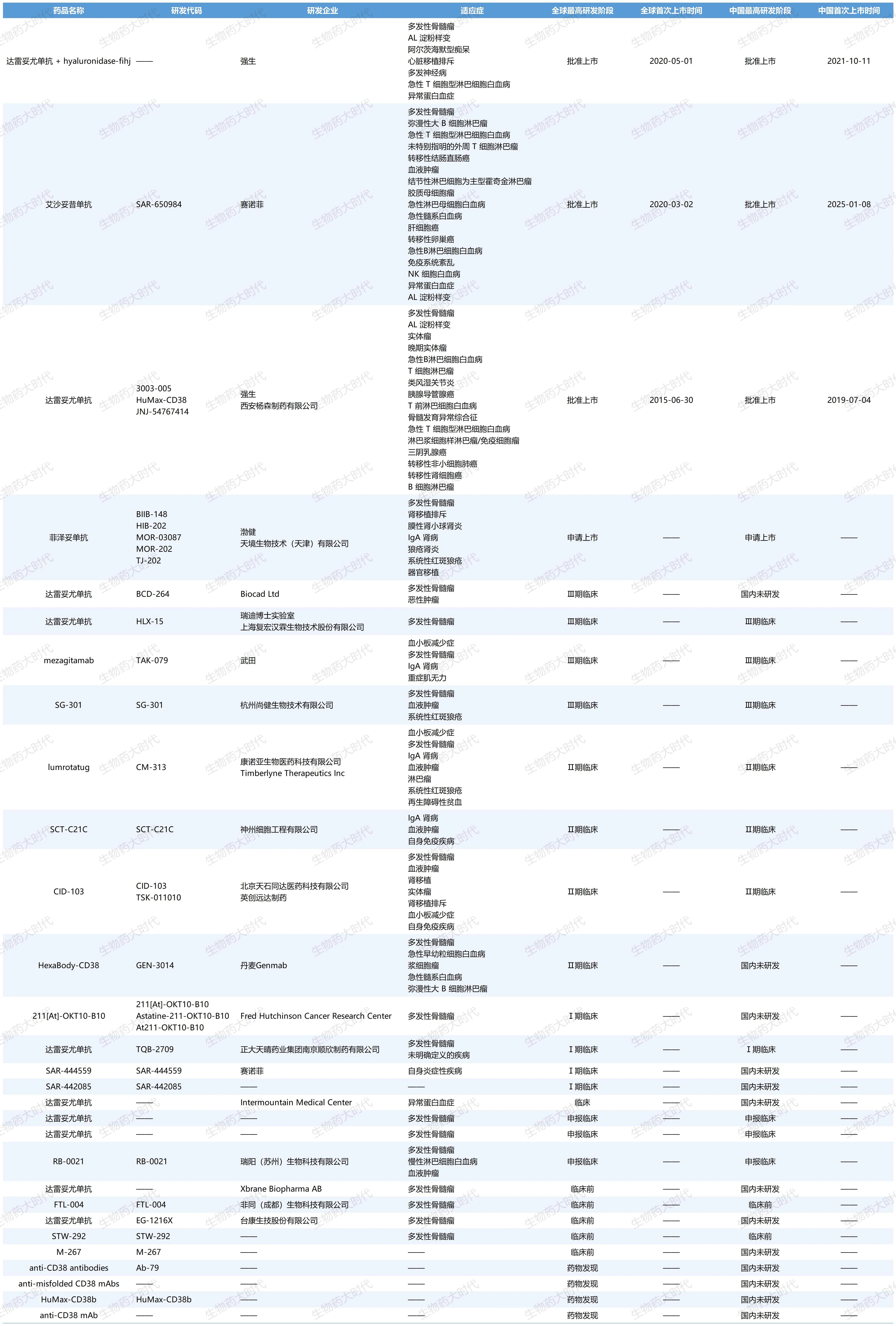 根据摩熵医药数据库显示,CD38靶点药目前在全球已有3款上市,除了全球首个获批的达雷妥尤单抗,还有赛诺菲的艾萨妥昔单抗,获批适应症亦为多发性骨髓瘤;最后一款是达雷木单抗-透明质酸酶,仍然是杨森制药的原研药。