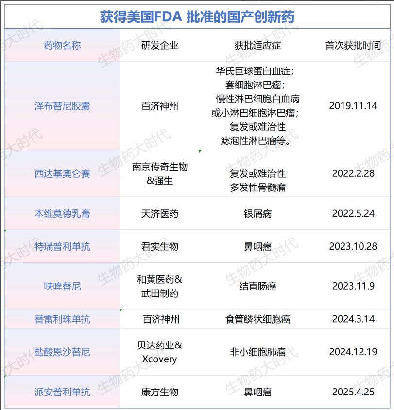 其中康方生物于2025年4月26日宣布,其自主研发的派安普利单抗注射液获得FDA批准上市,用于治疗复发或转移性鼻咽癌的一线治疗和以铂类为基础的至少一线化疗治疗进展后治疗。