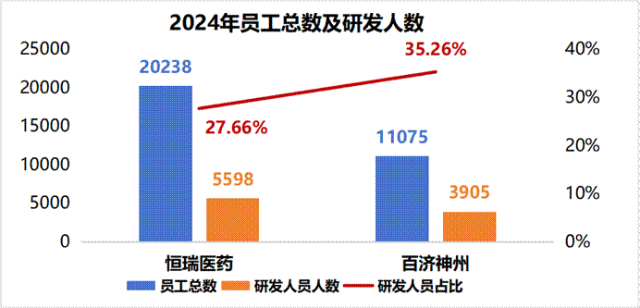 恒瑞医药和百济神州是国内创新药赛道两家头部公司,目前市值3400多亿,旗鼓相当。近期恒瑞医药也将登陆港交所主板,实现“A+H”两地上市。我们根据2家公司2024年/2025Q1财报,从业绩情况、境外营收占比、研发投入、管线布局、员工变化、员工薪酬与人效等方面做一个比较。