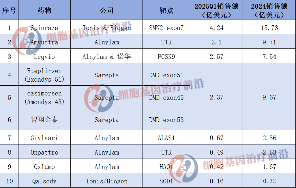 Alnylam 成为最大赢家之一,旗下 Amvuttra(TTR 靶点,Q1 营收 3.1 亿美元 )、Leqvio(PCSK9 靶点,Q1 营收 2.57 亿美元 )、Givlaari(ALAS1 靶点,Q1 营收 0.67 亿美元 )、Onpattro(TTR 靶点,Q1 营收 0.49 亿美元 )、Oxlumo(HAO1 靶点,Q1 营收 0.42 亿美元 )5 款产品上榜,覆盖罕见病、心血管等领域。其中,Amvuttra 2024 年销售额 9.71 亿美元,展现出 RNAi 技术平台的商业化潜力;Leqvio 与诺华合作,借助跨国药企渠道,加速市场渗透,2024 年 7.54 亿美元的营收,验证了 “小核酸 + 巨头协作” 的商业价值。