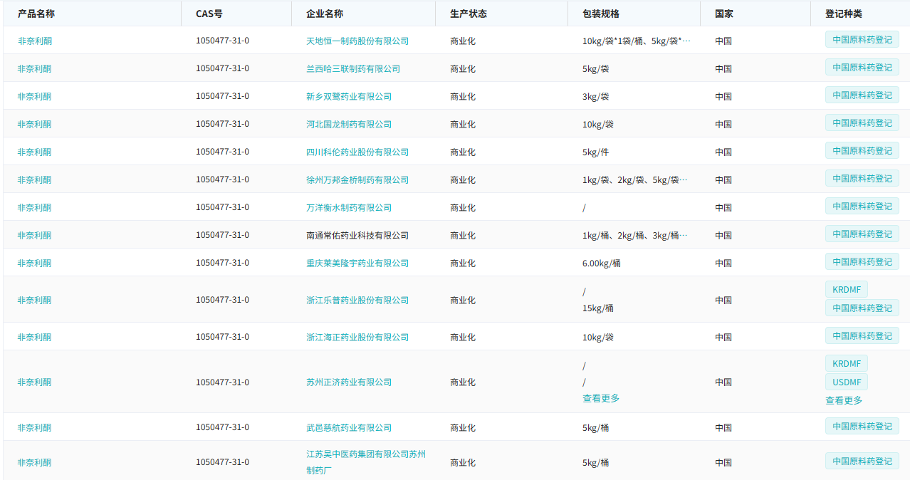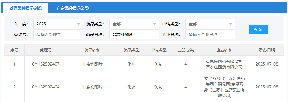 7月8日,CDE官网显示,石家庄四药有限公司与复星万邦(江苏)医药集团有限公司递交了4类仿制化药非奈利酮片的上市申请,均获受理。