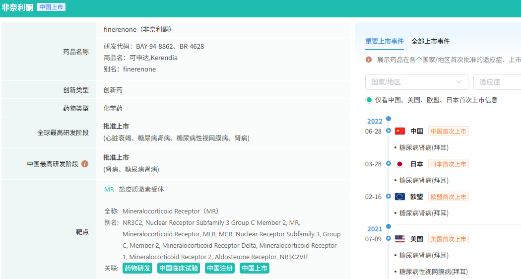 非奈利酮是拜耳(Bayer)开发的"first-in-class"非甾体、选择性盐皮质激素受体拮抗剂(MRA)。2021年7月FDA批准非奈利酮在美国上市。2022年6月28日,非奈利酮在中国获批用于与2型糖尿病相关的慢性肾脏病(CKD)成人患者,商品名“可申达”。