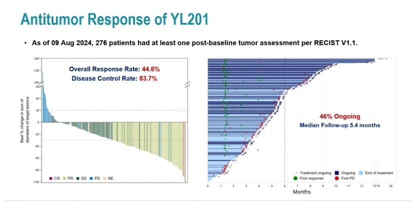 2023年11月,YL201获得美国食品和药物管理局(FDA)授予的孤儿药资格,用于治疗食管癌(EC)。2024年9月,宜联生物在2024年欧洲肿瘤内科学会(ESMO)上,公布了YL201的积极临床数据,显示YL201在包括小细胞肺癌、鼻咽癌、野生型非小细胞肺癌在内的多种实体瘤展示出令人鼓舞的抗肿瘤效果。
