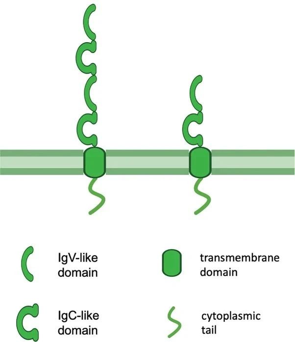 B7-H3(CD276)是一种I型跨膜蛋白,属于B7免疫共刺激和共抑制家族成员,其配体尚不明确。2001年,B7-H3首次被发现并确定为B7家族成员;同时,也证实了B7-H3与其他家族成员存在20%-27%相似性。B7-H3蛋白由染色体15q24基因编码,结构上包括涵盖胞外域、跨膜域和短胞内域在内的316个氨基酸组成。B7-H3蛋白胞内结构域很短,尚无已知的信号基序。此外,由于外显子重复,人B7-H3蛋白包含一对或两对相同的胞外结构域造成了两种亚型:2IgB7-H3由一对免疫球蛋白可变区(IgV)样和免疫球蛋白恒定区(IgC)样胞外结构域组成;4IgB7-H3包含两对相同的IgV样和IgC样胞外结构域,也是人类细胞中的主要亚型。