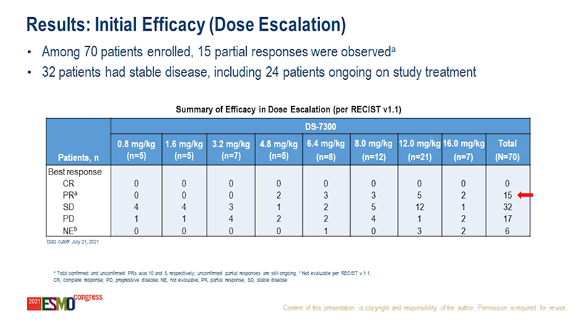 2021年9月,第一三共首次公布了DS-7300的临床试验数据,其1/2期临床数据显示,在70例晚期/不可切除或转移性实体瘤成人患者中,15例患者确认PR,另有32例患者病情稳定,该数据表明DS-7300在既往接受治疗的晚期实体瘤患者中临床疗效和总体耐受性良好。