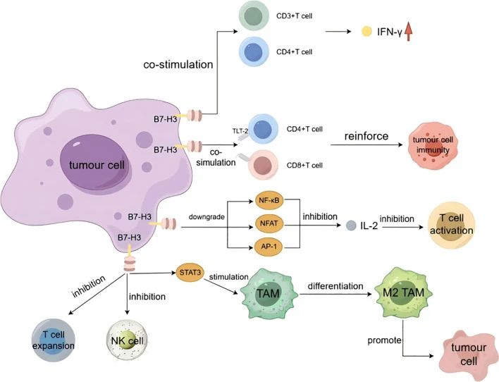研究发现,B7-H3是一种共刺激/共抑制分子,其具有对CD4+和CD8+细胞的共刺激作用,作为一种共刺激分子,B7H3信号诱导细胞免疫,促进细胞因子 IFN-γ、IL-8、TNF-α 等的分泌,增强CD8+T细胞的细胞毒作用;另外,B7-H3通过与CD4+和CD8+T细胞上表达的TLT-2结合,增强T细胞活化,从而增强抗肿瘤免疫。
