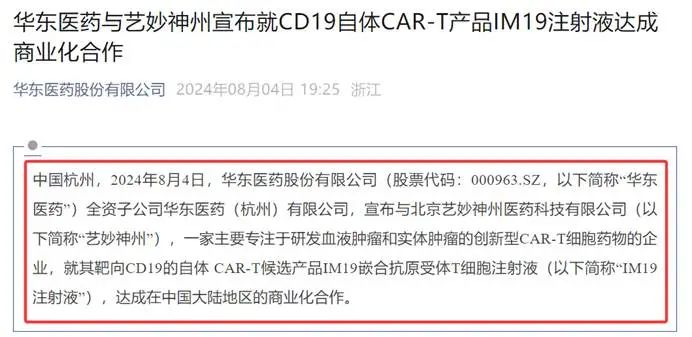 2024年8月4日,华东医药与艺妙神州联合宣布,双方针对靶向CD19的自体CAR-T候选产品IM19嵌合抗原受体T细胞注射液达成在中国大陆地区的商业化合作。艺妙神州将获得1.25亿元人民币首付款,并有权获得最高不超过9.5亿人民币的注册及销售里程碑付款,艺妙神州将继续负责IM19注射液在中国大陆地区的开发、注册和生产,华东医药将获得IM19注射液在中国大陆的独家商业化权益。目前,IM19注射液作为艺妙神州领先的管线产品,正在中国开展弥漫大B细胞淋巴瘤、套细胞淋巴瘤和急性B淋巴细胞白血病三个适应症的临床研究。同时,针对弥漫大B细胞淋巴瘤末线治疗的研究已开展II期临床试验。与此同时,2024年11月28日,IM19的上市申请获国家药品监督管理局(NMPA)药品审评中心(CDE)受理,极有可能于今年获批上市。