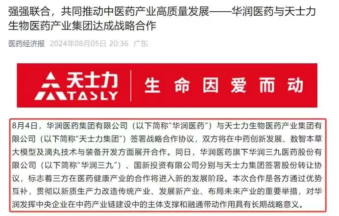 2024年8月4日,华润医药与天士力医药签署战略合作协议,双方将在中药创新发展、数智本草大模型及滴丸技术与装备开发方面展开合作。华润医药以62亿元控股天士力,这场并购也被视为“传统药企与数字革命的联姻”。双方计划以合资公司为载体,开展全球首个中医药研发多模态大模型“数智本草”的迭代升级,把中医药理论、临床经验与数字科技相结合,构建数智中药研发新范式。值得注意的是,通过与华为云合作开发“数智本草大模型”,天士力医药将AI技术贯穿于靶点发现、分子筛选到组方优化的全流程,使研发效率提升33%,成本降低70%。除此之外,双方还成立滴丸技术创新联合体,推动滴丸技术迭代升级,并把天士力建设成高科技、高质量的滴丸新剂型专业化生产基地,为更多企业提供产业化服务。
