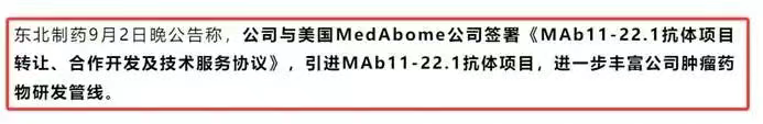 1)东北制药与MedAbome合作(MAB11-22.1抗体):打造ADC药物和CAR-T细胞治疗技术平台