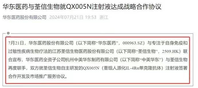 华东医药与荃信生物就QX005N注射液达成合作协议(来源:华东医药股份有限公司)