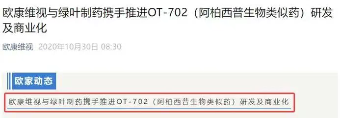 绿叶制药与欧康维视携手推进OT-702(阿柏西普生物类似药)研发及商业化(来源:欧康维视)