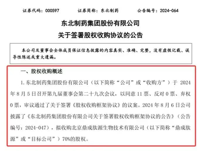 东北制药收购鼎成肽源(来源:东北制药)