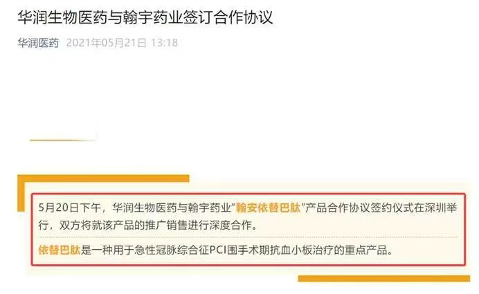 2021年5月20日,华润医药与翰宇药业就“翰安依替巴肽”注射液产品合作协议签约仪式,双方将就该产品的推广销售进行深度合作。依替巴肽作为一种用于急性冠脉综合征PCI围手术期抗血小板治疗的重点产品,通过此次合作,华润医药将在心脑血管领域产品线带来更多的产品;翰宇药业也可以充分借助华润生物在心脑血管领域的优势,快速完成在PCI领域产品管线广度及深度的开发覆盖。值得一提的是,翰安依替巴肽注射液目前已成功获得美国美国食品药品监督管理局(FDA)批准上市,成功完成出海!