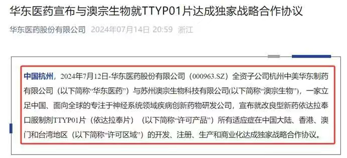 2024年7月12日,华东医药全资子公司中美华东与澳宗生物就TTyp01片所有适应症在中国大陆、香港、澳门和台湾地区的开发、注册、生产和商业化达成独家战略合作协议。澳宗生物将获得1亿元人民币的首付款,最高不超过11.85亿元的开发、注册及销售里程碑付款。TTyp01片作为澳宗生物自主开发的改良型新药,是一款依达拉奉口服片剂,急性缺血性脑卒中适应症已完成国内临床Ⅲ期研究。值得注意的是,2024年12月25日, TTYP01片已向美国食品药品监督管理局(FDA)正式递交了新药上市申请(NDA),用于治疗肌萎缩侧索硬化症(ALS,又称渐冻症)。