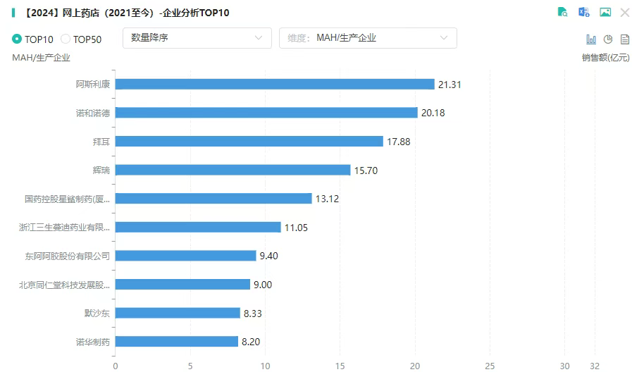 生产企业TOP10榜单中,销售额超10亿元的有6家,阿斯利康以超21亿元销售额领跑,诺和诺德、拜耳、辉瑞分列二至四位。本土企业表现亮眼,国药控股星鲨制药(市场份额9.78%)、三生蔓迪药业(8.24%)、东阿阿胶(7.01%)、北京同仁堂(6.71%)四家入围,合计占据31.74%市场份额。其中,国药控股星鲨制药(维生素D滴剂)与三生蔓迪药业(米诺地尔酊)凭借单品种实现超10亿元销售额,展现爆品打造能力。