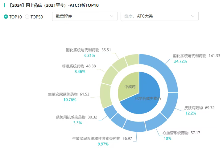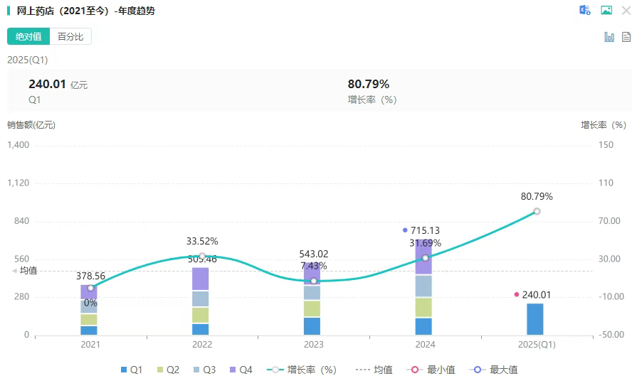 据摩熵医药数据库统计,2024年中国网上药店销售端药品销售额达715.13亿元,同比增长31.69%,创历史新高。其中化学药表现尤为亮眼,销售额451.33亿元,同比增长34.62%,占总市场份额63.11%;中成药销售规模235.7亿元,同比增长22.34%,占比32.96%。2025年第一季度涨势延续,化学药同比激增94.96%,中成药增速达58.86%。