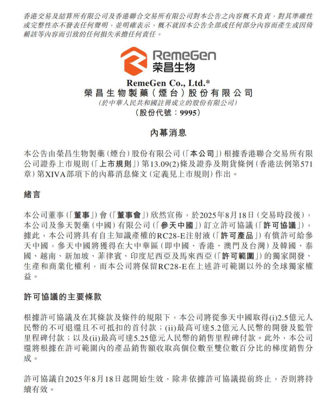 2025年8月19日,荣昌生物与日本参天制药全资子公司参天中国正式签订许可协议。荣昌生物将其自主研发的VEGF/FGF双靶标融合蛋白药物RC28-E注射液在大中华区(包括中国大陆、香港、澳门及台湾)及韩国、泰国、越南等七个亚洲主要市场的开发、生产和商业化权利授予参天制药。