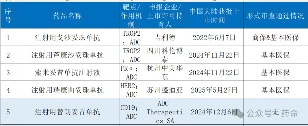 除替朗妥昔单抗外,其余已上市的4款ADC药物均通过今年的形式审查,且均申报了基本医保,仅戈沙妥珠单抗申报了商保。