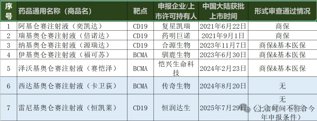 恒润达生的雷尼基奥仑赛(上市时间错过今年目录申报窗口期)和传奇生物的西达基奥仑赛未进入今年的通过形式审查名单。