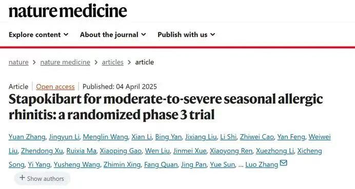 2025年4月,首都医科大学附属北京同仁医院张罗教授团队在《Nature Medicine》发表的III期临床试验结果显示,司普奇拜单抗作为全球首个获批治疗季节性过敏性鼻炎的IL-4Rα单抗,能精准阻断IL-4和IL-13信号通路,显著缓解中重度患者的鼻部和眼部症状,且安全性良好。