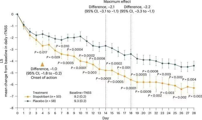 具体而言,司普奇拜单抗能够快速缓解鼻塞,治疗2天,患者鼻塞症状较安慰剂组显著改善;7天内72%的患者实现鼻腔通气,2周和 4周这一比例分别达86%和94%。此外,司普奇拜单抗还能持续控制鼻部症状,治疗4天,患者每日回顾性鼻部症状总分(rTNSS)较基线下降2.7分;2周后下降 3.6分,62%的患者鼻部症状达到轻或无;4 周后下降4.9分,84%的患者症状轻或无。除此之外,治疗4周,与安慰剂相比,司普奇拜单抗能够降低患者过敏源特异性IgE、血清总 IgE 水平,以及鼻腔分泌物中半胱氨酸蛋白酶抑制剂 SN(CST-1)、嗜酸性粒细胞活化趋化因子 Eotaxin-3等2型炎症标志物水平,从机制上阻止疾病进展。总的来说,该药通过抑制2型炎症反应,从根源上控制过敏进程。