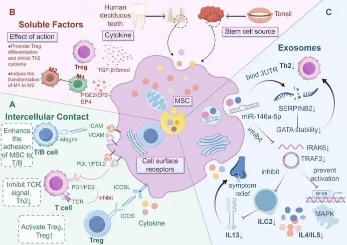 间充质干细胞(MSCs)的免疫调节机制;A. 细胞间接触;B. 可溶性因子;C. 外泌体