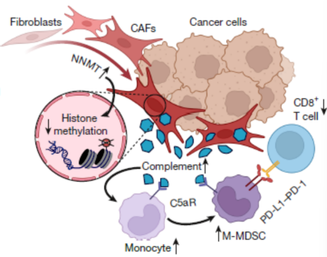 ①作用机制:NNMT在CAFs中高表达,通过改变表观遗传和代谢程序将正常成纤维细胞转化为促进肿瘤的成纤维细胞,并分泌补体蛋白,吸引髓源性抑制细胞(MDSCs)进入肿瘤。CAFs中NNMT的上调与高级别浆液性卵巢癌中CD8+ T细胞活化降低有关。