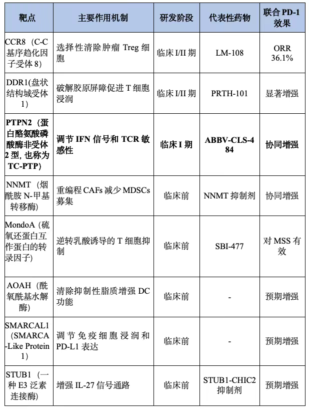 - 为突破PD-1/PD-L1抑制剂响应率有限、耐药和毒副作用的局限性,肿瘤免疫治疗的重点已从传统免疫检查点转向CCR8、PTPN2、NNMT等作用于肿瘤微环境多方面机制的新兴靶点。