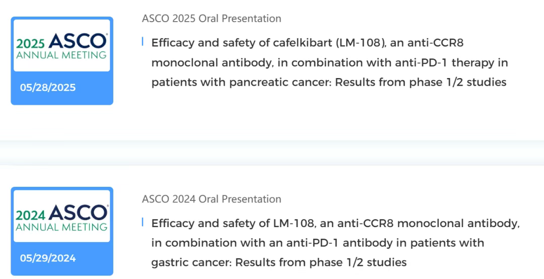 2024年ASCO大会数据显示,LM-108联合PD-1抗体用于治疗48例晚期胃癌患者的ORR为36.1%。在接受过一线治疗的患者中,ORR为63.6%;其中CCR8高表达亚组的ORR达到了87.5%。2025年ASCO大会上,它在胰腺癌中的数据同样亮眼:在80例一线治疗失败、65%存在肝转移的难治性患者中,ORR达20.3%,中位总生存期(OS)10.02个月,接近一线化疗水平;CCR8高表达患者的ORR更是达到33.3%。