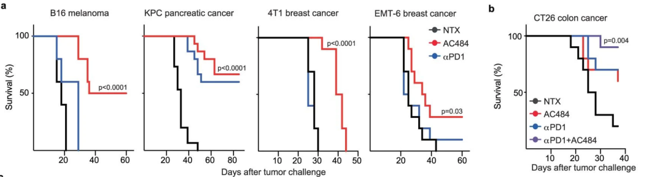 图2AC484(红色),抗PD-1(蓝色),两者联用(紫色)的动物存活率