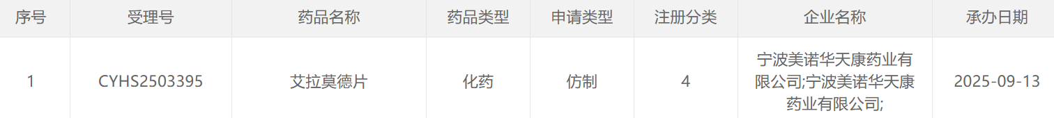 9月13日,美诺华的艾拉莫德片上市申请获CDE受理,这已经是该品种的第35家仿制企业。